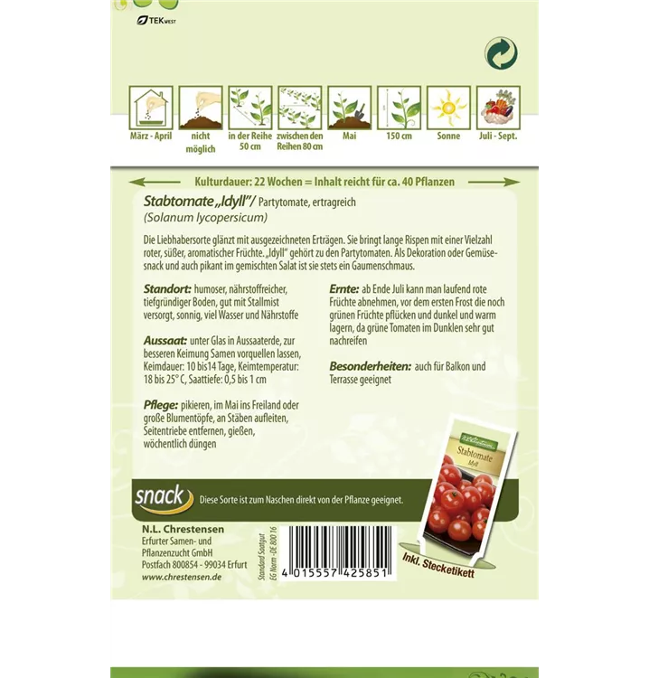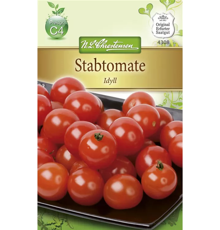 Die Stabtomate 'Idyll' (Solanum lycopersicum) bildet kleine Früchte, die süß, aromatisch schmecken und bereits ab Juli geerntet werden können. Für das optimale Wachstum der Stabtomate 'Idyll' werden ein sonniger Standort und durchlässiger, nährstoffreicher Boden benötigt.