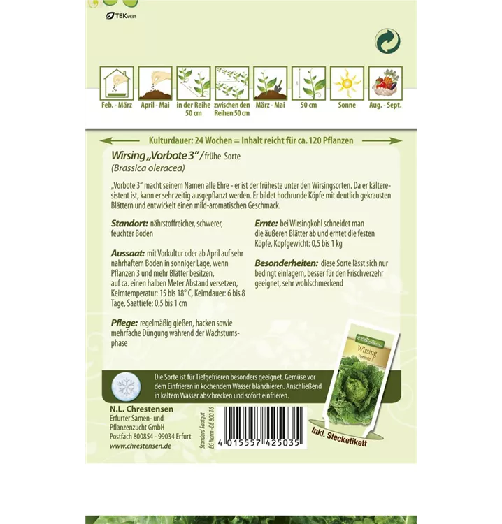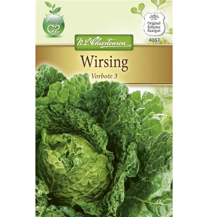 Der Wirsingkohl 'Typ Vorbote' (Brassica oleracea var. capitata) ist eine würzig, mild schmeckende Gemüsepflanze. Seine Blätter können geerntet werden, sobald er ca. 40 erreicht hat. Für das optimale Wachstum des Wirsingkohls 'Typ Vorbote' werden ein sonniger Standort und durchlässiger, nährstoffreicher Boden benötigt.