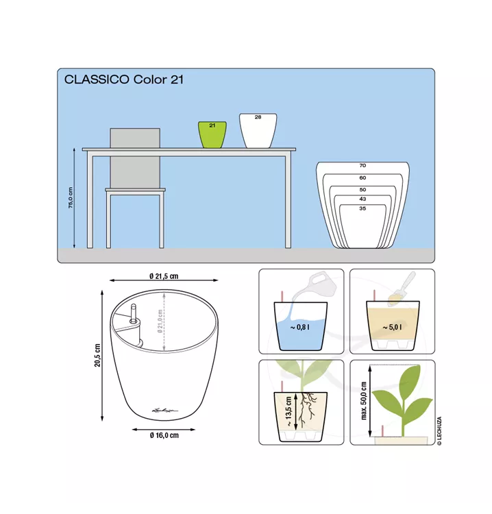 Das beliebte Pflanzgefäß CLASSICO Color darf mit seiner zeitlosen Form und den dezenten matten Farben in keinem Zuhause fehlen. Ob im Innen- oder Außenbereich, CLASSICO Color fügt sich in den unterschiedlichen Größenvarianten wunderbar in jedes Ambiente ein und ist ein Must-Have für alle Pflanzenliebhaber. Dank des integrierten Original LECHUZA Bewässerungssystems versorgen sich die Pflanzen individuell angepasst nach dem Vorbild der Natur mit Feuchtigkeit. Im Außenbereich schützt die herausdrehbare Bodenschraube bei starkem Regen vor Staunässe. Das schlichte Design und die seidenmatte Oberfläche in den harmonischen Farben setzen Zimmer- und Outdoorpflanzen modern in Szene und machen das Pflanzgefäß zu einem unverzichtbaren Partner.