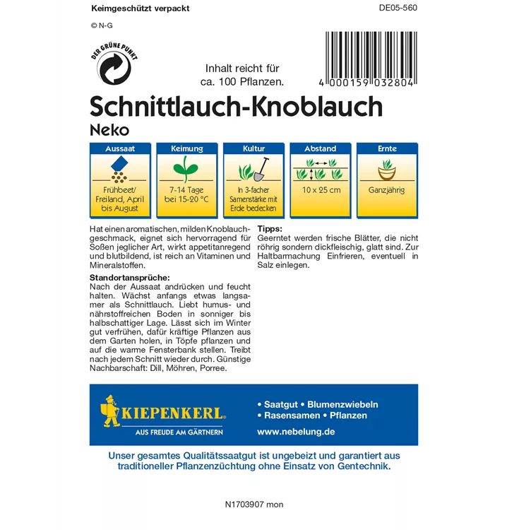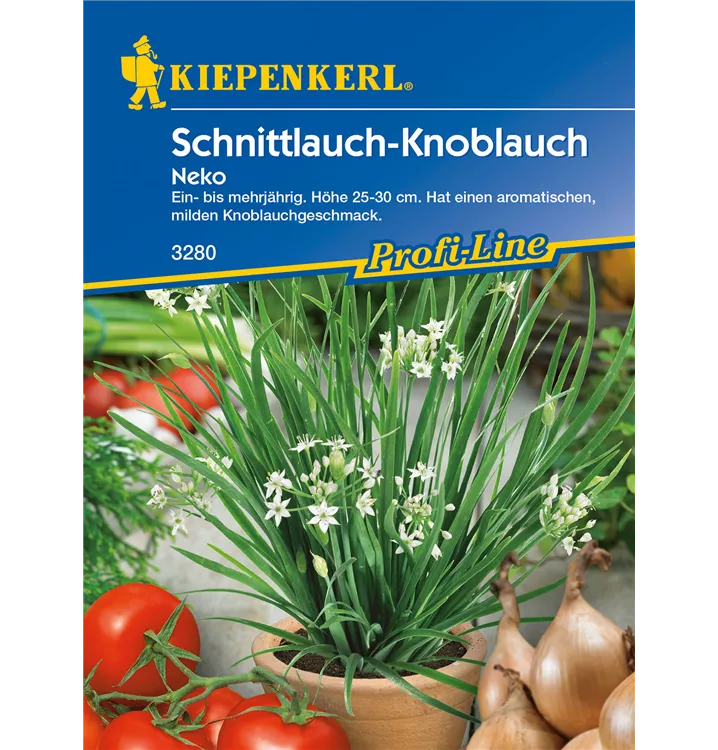 Der Schnittknoblauch 'Neko' (Allium tuberosum) ist eine würzig schmeckende Gemüsepflanze. Seine Blätter können geerntet werden, sobald er ca. 20 erreicht hat. Für das optimale Wachstum des Schnittknoblauchs 'Neko' werden ein sonniger Standort und durchlässiger, nährstoffreicher Boden benötigt.