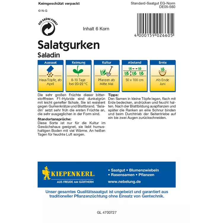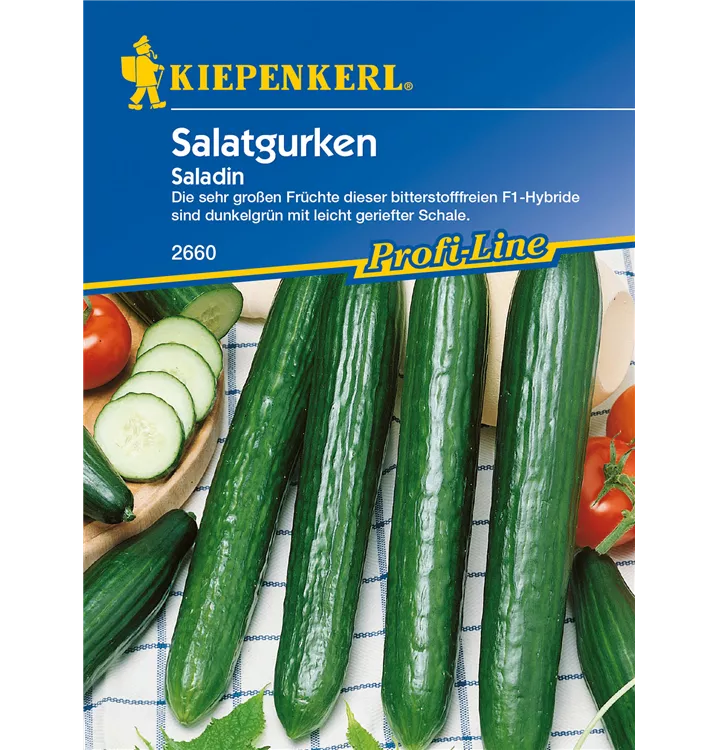 Die Gurke 'Saladin' (Cucumis sativus) bildet Früchte, die aromatisch schmecken und bereits ab Juni geerntet werden können. Für das optimale Wachstum der Gurke 'Saladin' werden ein sonniger Standort und durchlässiger, nährstoffreicher Boden benötigt.