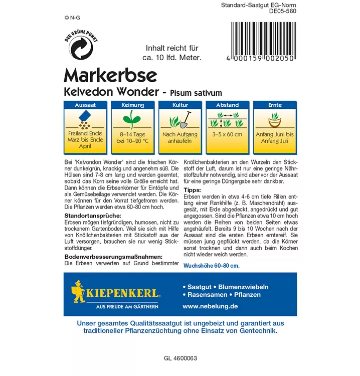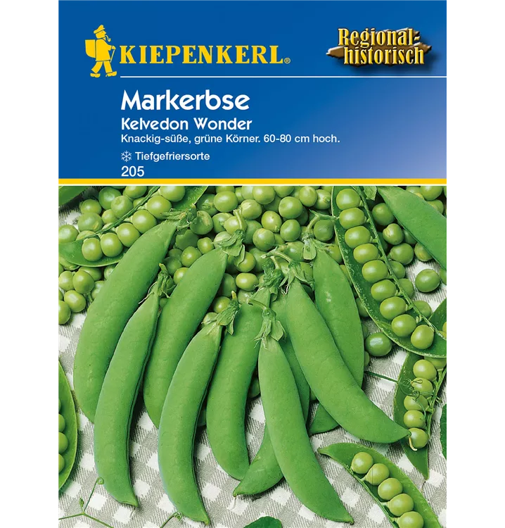 Die Markerbse 'Wunder von Kelvedon' (Pisum sativum) bildet Samenkörner, die süß, aromatisch schmecken und bereits ab Juni geerntet werden können. Für das optimale Wachstum der Markerbse 'Wunder von Kelvedon' werden ein sonniger Standort und durchlässiger, nährstoffreicher Boden benötigt.