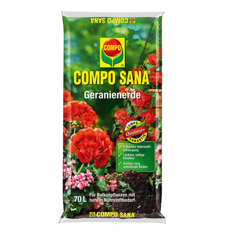Hochwertige Spezialerde für Geranien und starkzehrende Pflanzen auf Balkon und Terrasse. Der auf die Bedürfnisse der Pflanzen abgestimmte Sofort- und Langzeitdünger gewährleistet eine bis zu 12 Wochen optimale Nährstoffversorgung. Perlite Atmungsflocken und COMPO Gärtnerhumus sorgen für eine lockere, luftige Struktur des Substrates und die Bildung schöner, lang anhaltender Blüten.