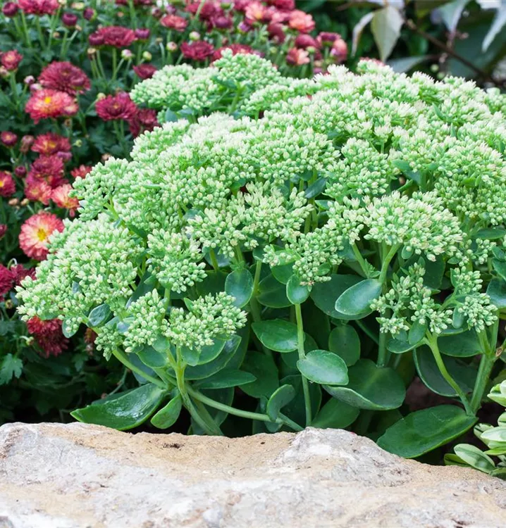 Das Große Garten-Fettblatt (Sedum telephium) ist eine buschige, aufrechte Staude, die von September bis Oktober dunkelrosafarbene, in Dolden angeordnete Blüten bildet. An einem sonnigen Standort mit durchlässigem, nährstoffreichem Boden erreicht es gewöhnlich eine Höhe von ca. 70 cm und wird ca. 60 cm breit. Das Große Garten-Fettblatt ist gut frostverträglich.