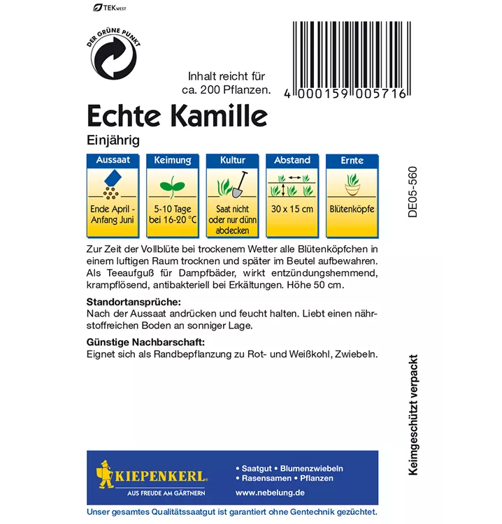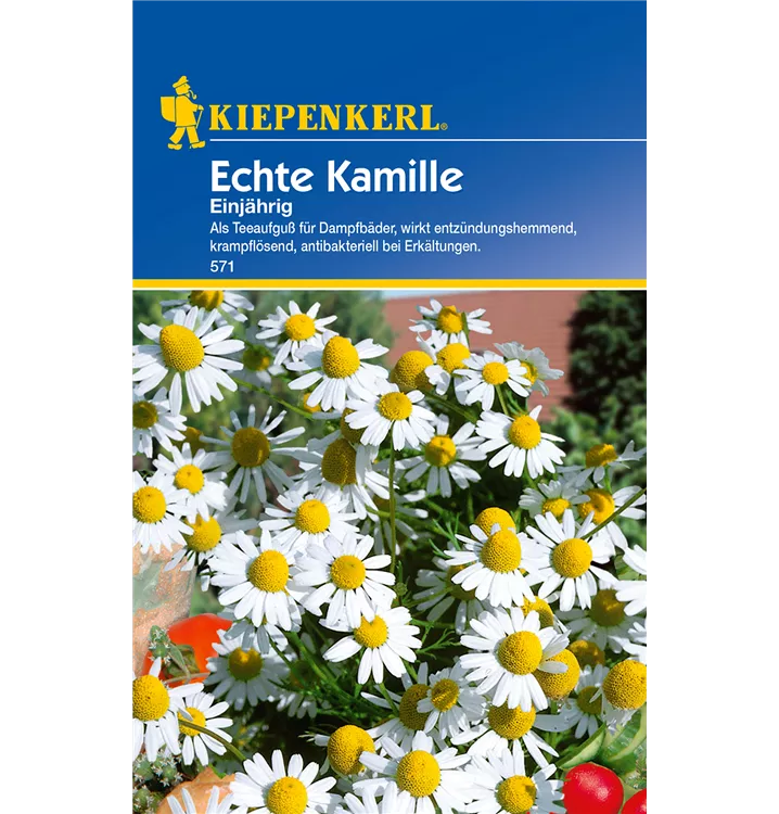 Die Echte Kamille (Matricaria recutita) ist eine Kräuterpflanze mit einem aromatischen Geschmack. Für das optimale Wachstum der Echte Kamille werden ein sonniger Standort und durchlässiger, nährstoffreicher Boden benötigt.