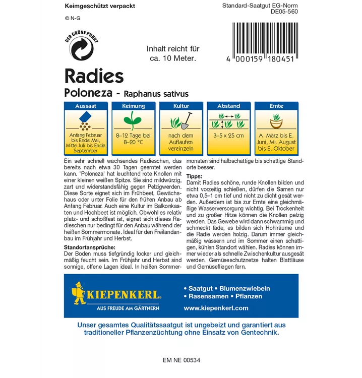 Das Radieschen 'Poloneza' (Raphanus sativus var. sativus) bildet Knollen, die aromatisch schmecken und bereits ab Juni geerntet werden können. Für das optimale Wachstum des Radieschens 'Poloneza' werden ein sonniger Standort und durchlässiger, nährstoffreicher Boden benötigt.