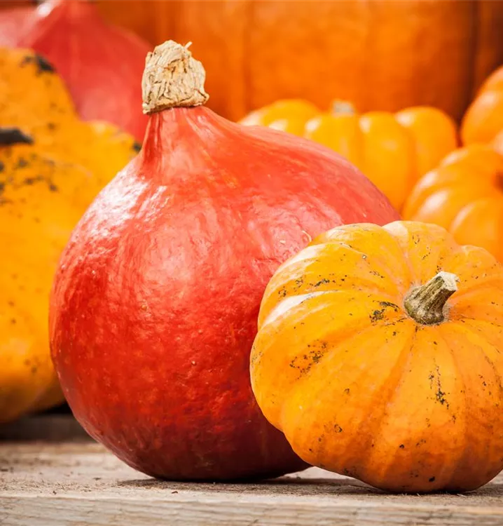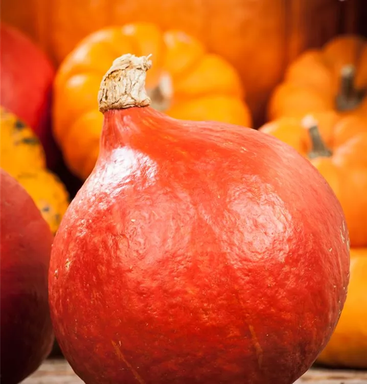 Der Kürbis 'Hokkaido' (Cucurbita pepo) bildet Früchte, die aromatisch schmecken und bereits ab September geerntet werden können. Für das optimale Wachstum des Kürbises 'Hokkaido' werden ein sonniger Standort und durchlässiger, nährstoffreicher Boden benötigt.