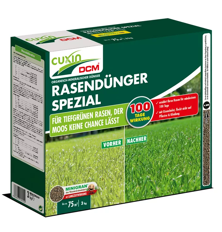 Langwirkender Rasendünger mit Eisenchelat: fleckt nicht auf Pflaster und Kleidung; in MINIGRAN®: staubarm und mit besserer Streufähigkeit