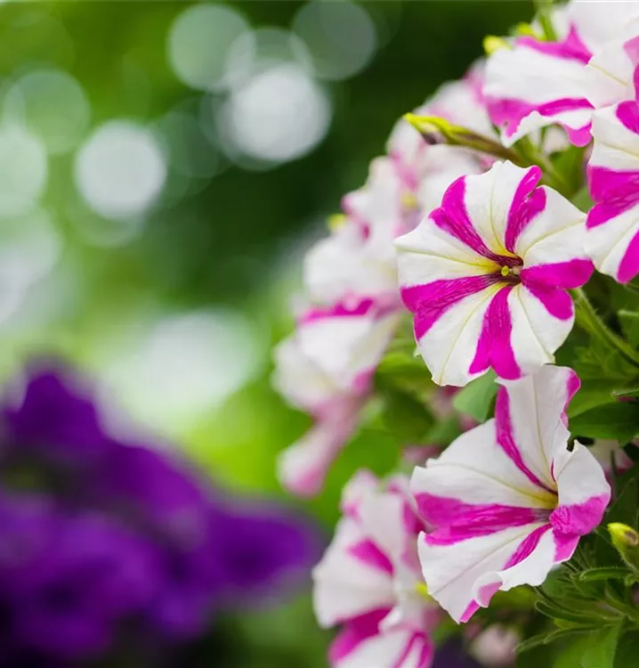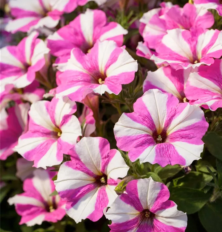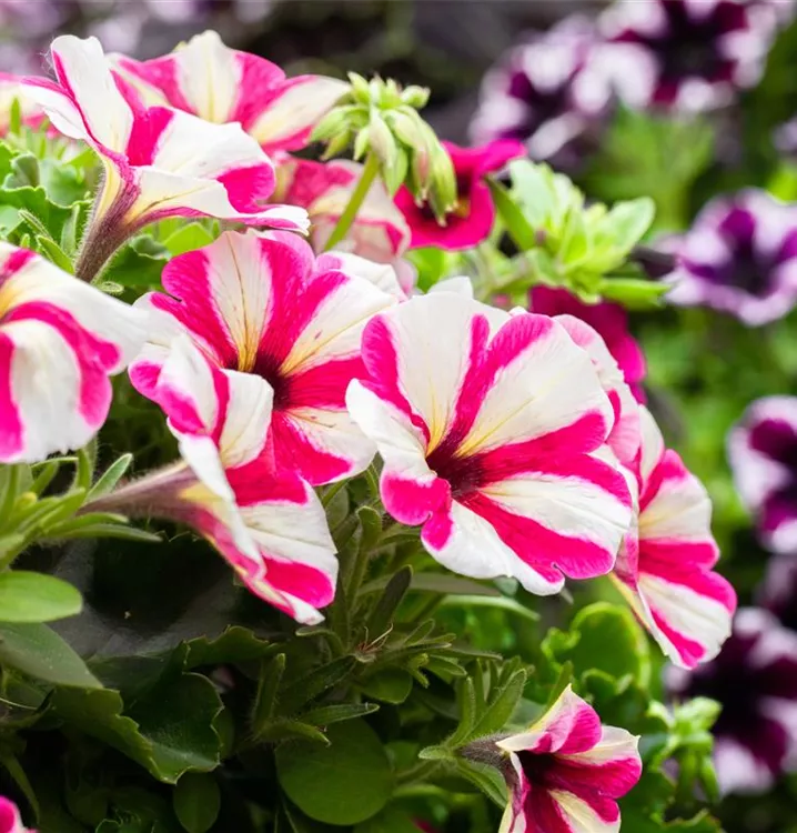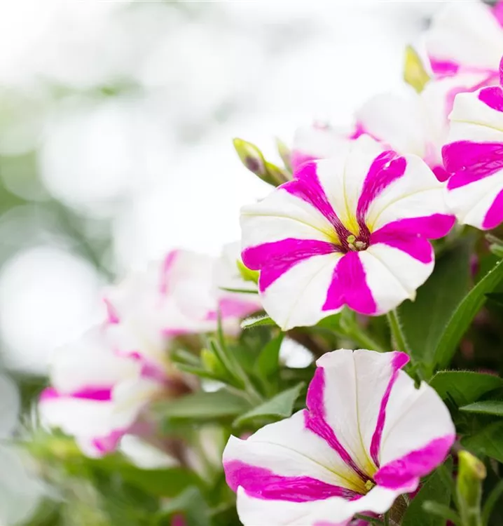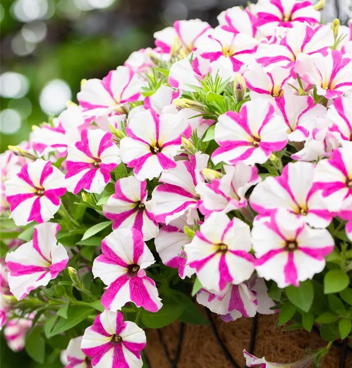 Die Petunie 'Surprise Pink Star' (Petunia) ist eine beliebte Pflanze für den Balkon. Die unzähligen Blüten erscheinen, je nach Sorte, in verschiedenen Farben die ganze Saison hindurch. Ein sonniger Standort und ein durchlässiges Substrat werden bevorzugt.