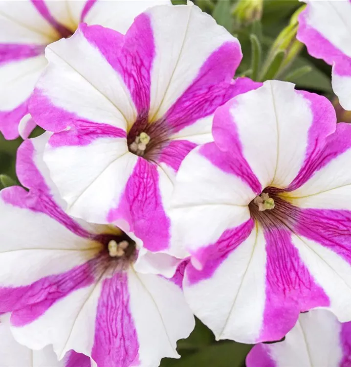 Petunia 'Surprise Pink Star' bildet während der gesamten Saison zahlreiche trichterförmige, pink-weiße Blüten.