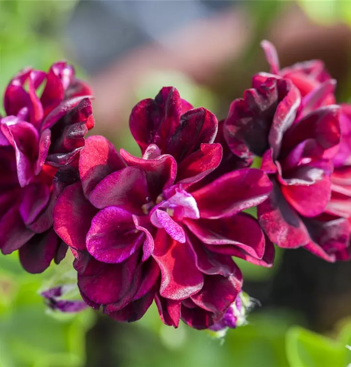 Pelargonium peltatum 'Tommy' bildet während der gesamten Saison zahlreiche gefüllte, dunkelrote Blüten.