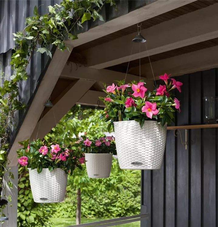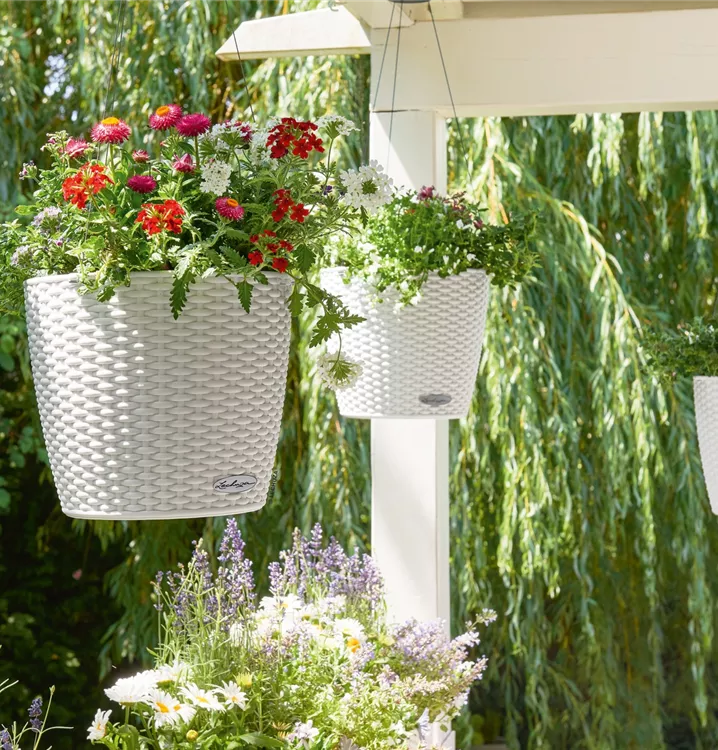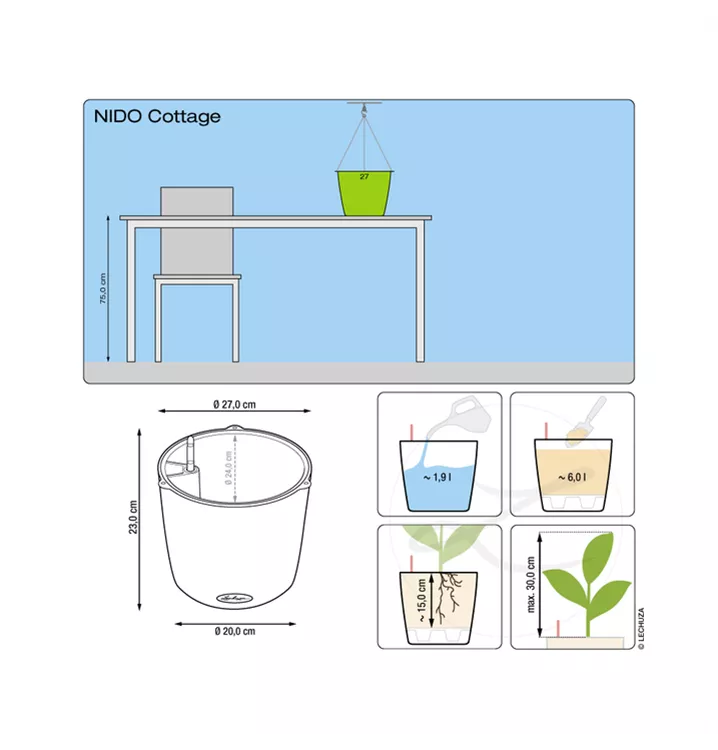 Das Pflanzgefäß NIDO Cottage, die Hängeampel von LECHUZA, eignet sich perfekt, um Kräuter oder Blühpflanzen auch in luftiger Höhe in Szene zu setzen. Die enthaltene Edelstahlaufhängung verleiht dem Gefäß Stabilität und trägt die sommerliche Blumenpracht besonders sicher. Alternativ kann das Gefäß NIDO dank des geraden Bodens auch als Tischgefäß verwendet werden.