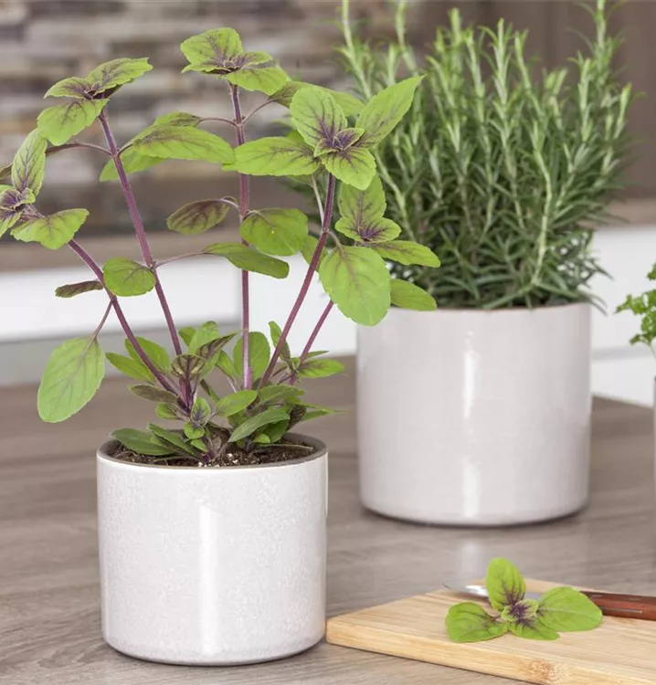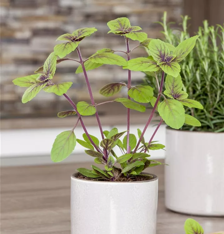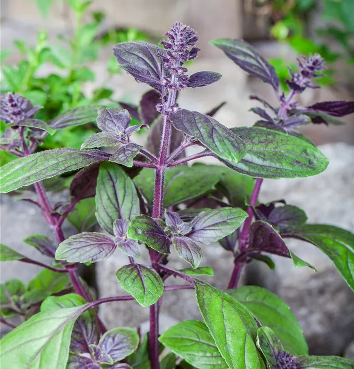 Zum Verzehr geeignet. Die grünen, violett geäderten, gewellten Blätter sind eiförmig und überzeugen mit würzigem Geschmack.