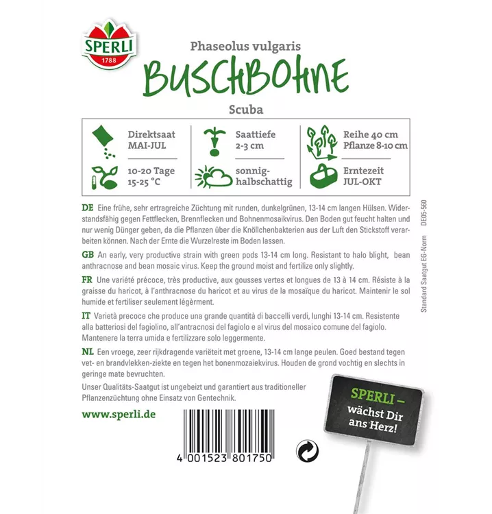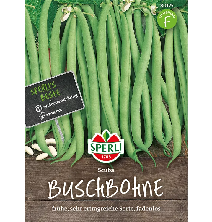 Die Buschbohne 'Scuba' (Phaseolus vulgaris) bildet Hülsenfrüchte, die aromatisch schmecken und bereits ab Juli geerntet werden können. Für das optimale Wachstum der Buschbohne 'Scuba' werden ein sonniger Standort und durchlässiger, nährstoffreicher Boden benötigt.