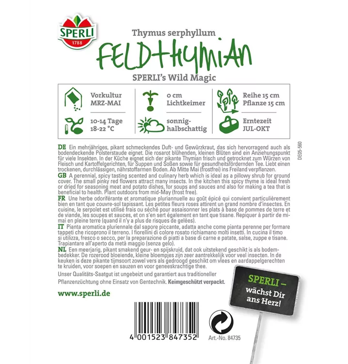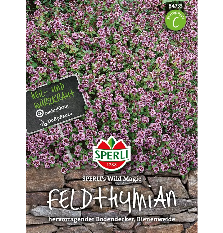 Der Feldthymian 'Wild Magic' (Thymus serpyllum) ist eine kriechende wintergrüne Staude, die von Juni bis August rosafarbene Blüten bildet. An einem sonnigen Standort mit durchlässigem, nährstoffreichem, sandigem Boden erreicht er gewöhnlich eine Höhe von ca. 10 cm und wird ca. 30 cm breit. Der Feldthymian 'Wild Magic' ist gut frostverträglich.