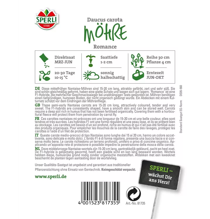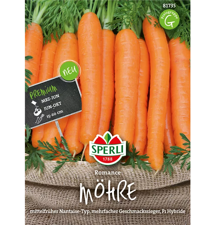 Die Möhre 'Romance' (Daucus carota var. sativus) bildet Wurzeln, die aromatisch schmecken und bereits ab Juni geerntet werden können. Für das optimale Wachstum der Möhre 'Romance' werden ein sonniger Standort und durchlässiger, nährstoffreicher Boden benötigt.