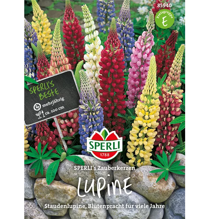 Die Garten-Lupine 'Zauberkerze' (Lupinus polyphyllus) ist eine buschige, aufrechte Staude, die von Juni bis September bunte Blüten mit einem angenehmen Duft bildet. An einem sonnigen Standort mit durchlässigem, kalkfreiem Boden erreicht sie gewöhnlich eine Höhe von ca. 1 m und wird ca. 60 cm breit. Die Garten-Lupine 'Zauberkerze' ist gut frostverträglich.