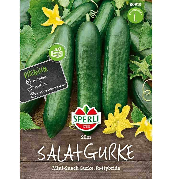 Die Gurke 'Silor F1' (Cucumis sativus) bildet Früchte, die aromatisch schmecken und bereits ab Juni geerntet werden können. Für das optimale Wachstum der Gurke 'Silor F1' werden ein sonniger Standort und durchlässiger, nährstoffreicher Boden benötigt.