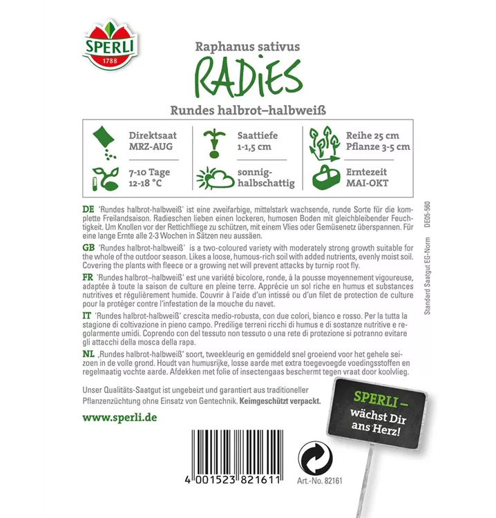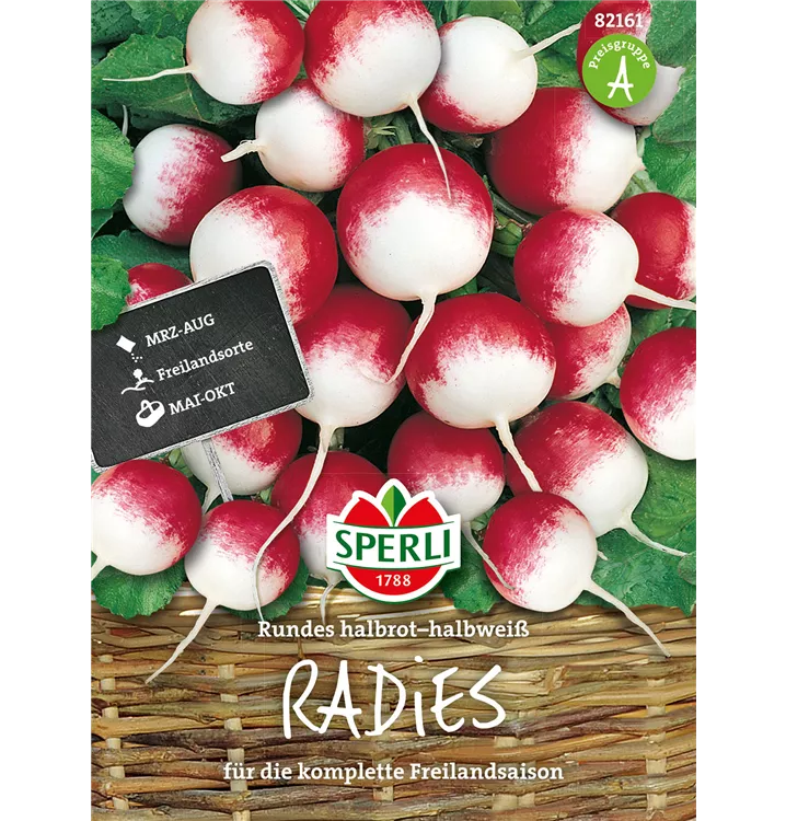 Das Radieschen 'Rundes Halbrot-Halbweiß' (Raphanus sativus var. sativus) bildet Knollen, die aromatisch schmecken und bereits ab Mai geerntet werden können. Für das optimale Wachstum des Radieschens 'Rundes Halbrot-Halbweiß' werden ein sonniger Standort und durchlässiger, nährstoffreicher Boden benötigt.