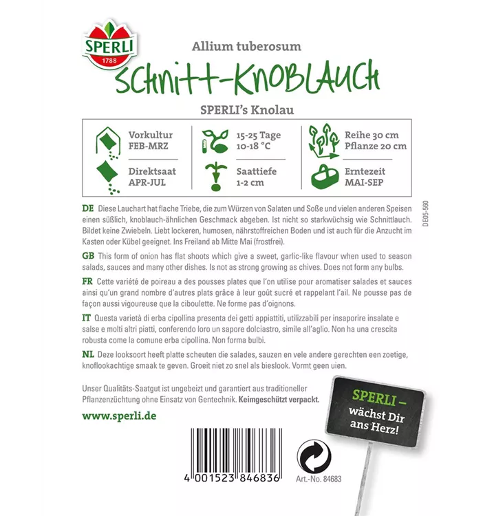 Der Schnittknoblauch 'Knolau' (Allium tuberosum) ist eine würzig schmeckende Gemüsepflanze. Seine Blätter können geerntet werden, sobald er ca. 40 erreicht hat. Für das optimale Wachstum des Schnittknoblauchs 'Knolau' werden ein sonniger Standort und durchlässiger, nährstoffreicher Boden benötigt.