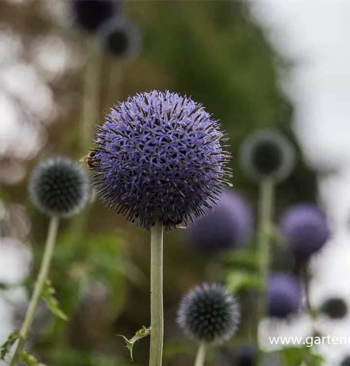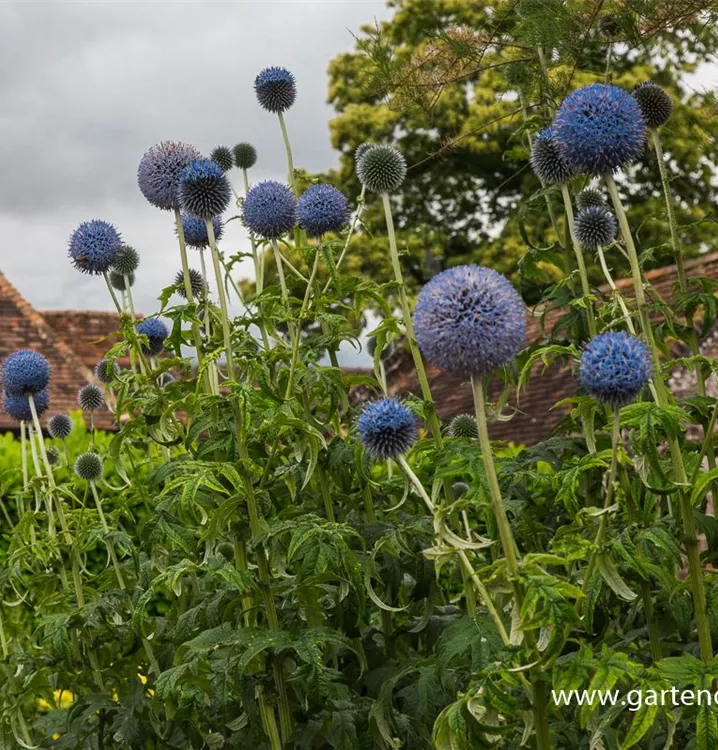 Echinops bannaticus 'Blue Globe' bildet ballförmige, dunkelblaue Blüten ab Juli.