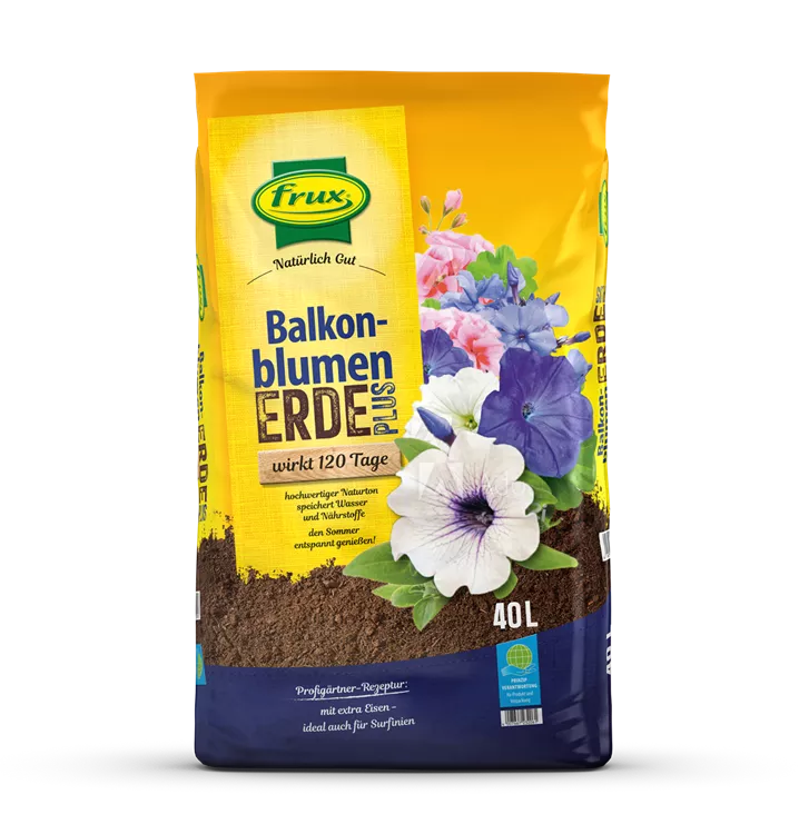 Die Balkonblumenerde Plus – mit Depotdünger ist ein gebrauchsfertiges Kultursubstrat, das genau auf die Bedürfnisse Ihrer Geranien, Petunien und anderer Balkonpflanzen abgestimmt ist. Durch den hohen Anteil an Naturton und die Verwendung von hochwertigen Torfersatzstoffen und Torf mit optimaler Struktur garantiert diese Erde eine sehr gute Wasser- und Nährstoffspeicherung. Die Erde bleibt vergießfest, atmungsaktiv und gibt durch den hohen Tonanteil Wachstums- und Blühsicherheit auch während länger dauernder Hitze- und Nässeperioden. frux Balkonblumenerde Plus enthält Vorratsdünger für 120 Tage und alle für das Pflanzenwachstum notwendigen Nährstoffe. Durch diese Grundversorgung wird das Wachstum der Balkonpflanzen optimal gefördert und ihre Pflege erleichtert.