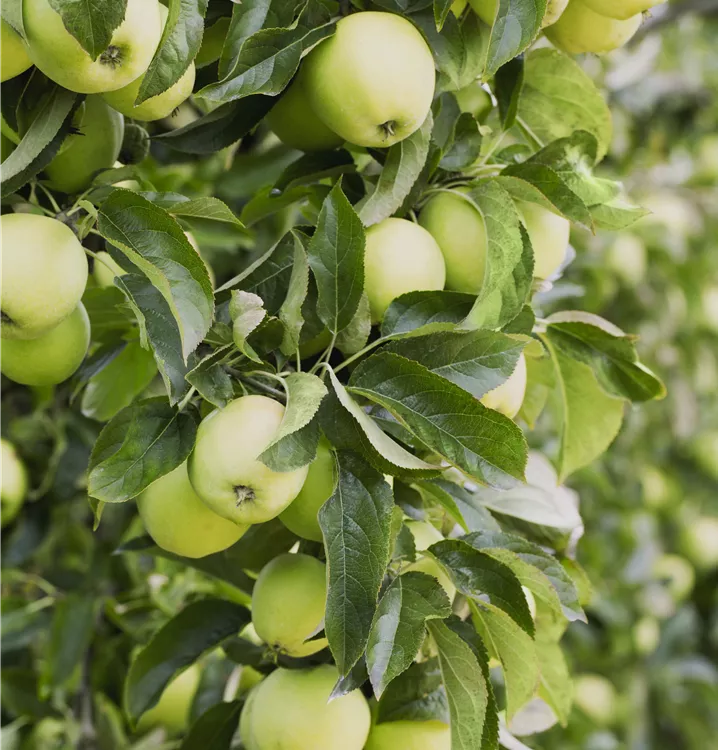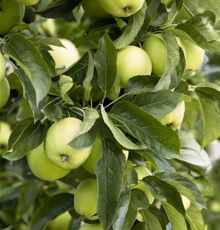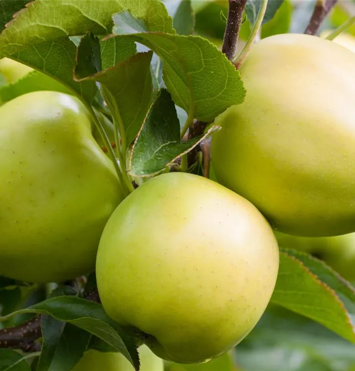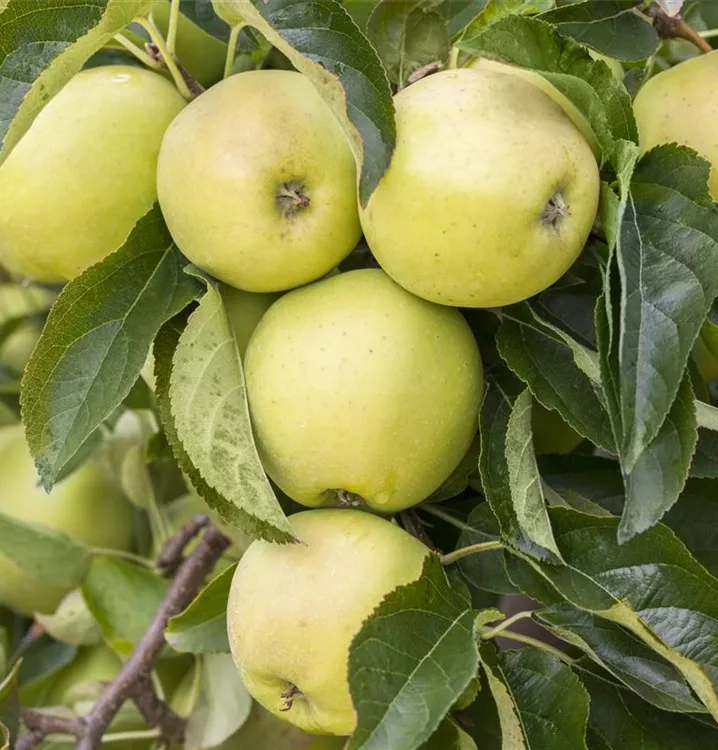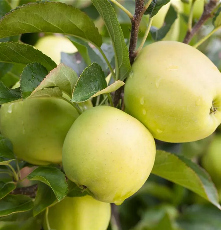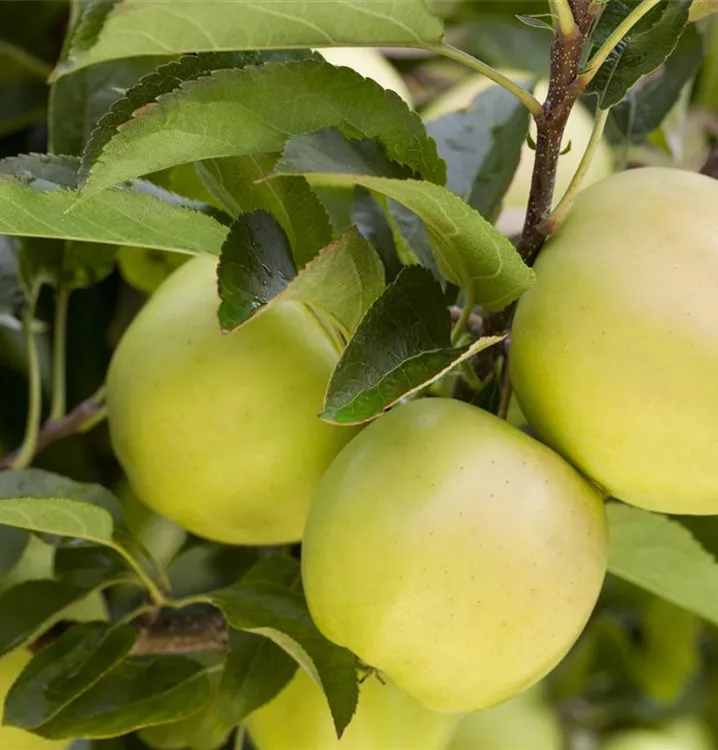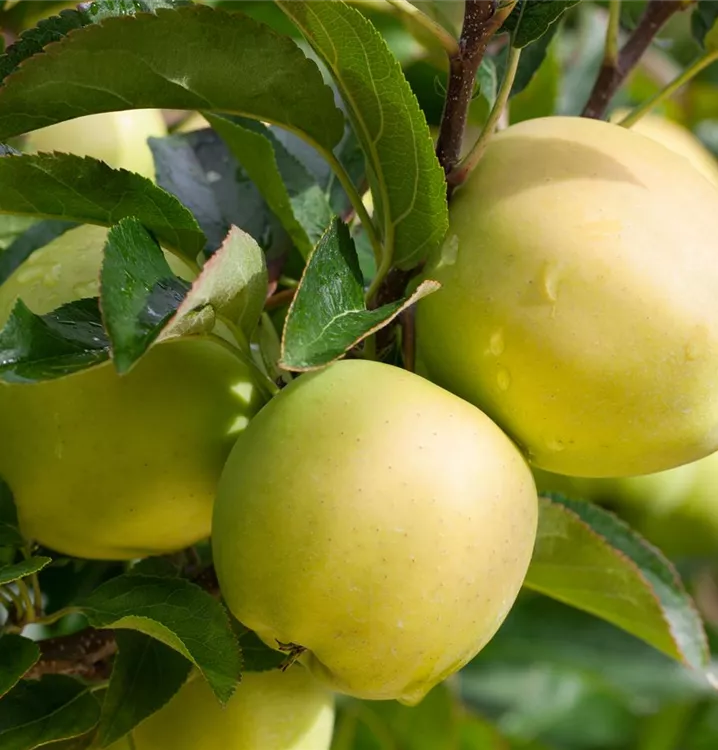 Der ertragreiche Apfel 'Golden Delicious' stammt ursprünglich aus West Virginia und ist wegen des süßen Aromas der saftigen Früchte bekannt geworden. Äpfel der 'Golden Delicious' enthalten nur wenig Säure und oxidieren nach Aufbrechen der Schale langsam im Vergleich zu anderen Sorten. Das sommergrüne Obstgehölz selbst bildet eine ausladende Krone, die keinen vollständigen Schatten wirft.