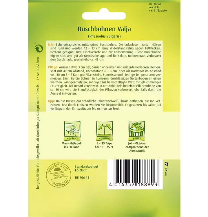 Die mittelgrünen Hülsenfrüchte haben einen aromatischen Geschmack. Reifezeit ab Juli.Die Hülsenfrüchte sind länglich.