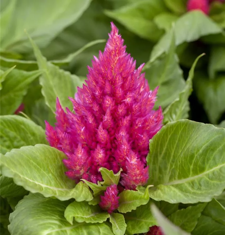 Celosia argentea var. plumosa 'Glow Pink' bildet während der gesamten Saison zahlreiche rosafarbene Blüten.