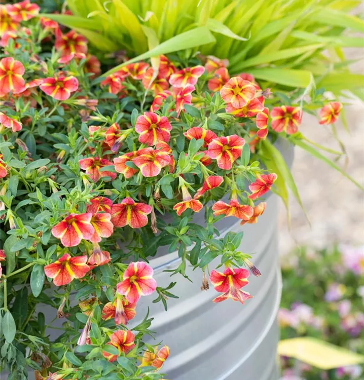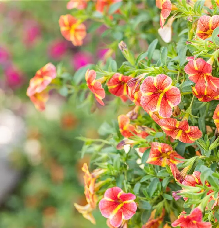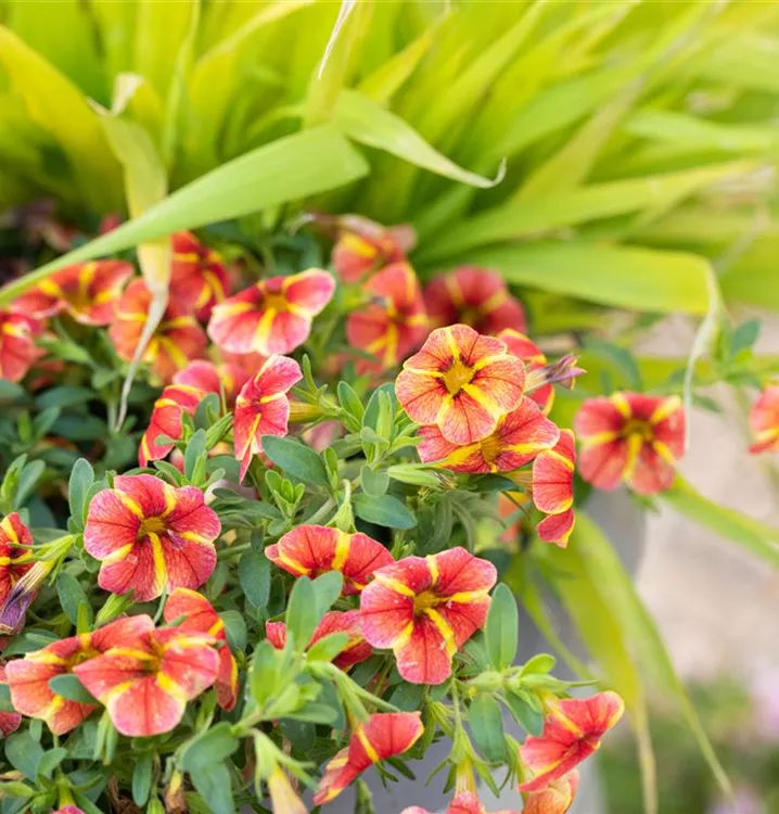 Die Zauberglöckchen 'Tangerine Star', Calibrachoa oder Carillon, ist eine beliebte Pflanze für den Balkon, die während der gesamten Saison unzählige rot-gelbe Blüten bildet. Die kleinblütige Petunie ist ein zuverlässiger und unkomplizierter Dauerblüher. Ein sonniger bis halbschattiger Standort und ein durchlässiges Substrat werden bevorzugt.