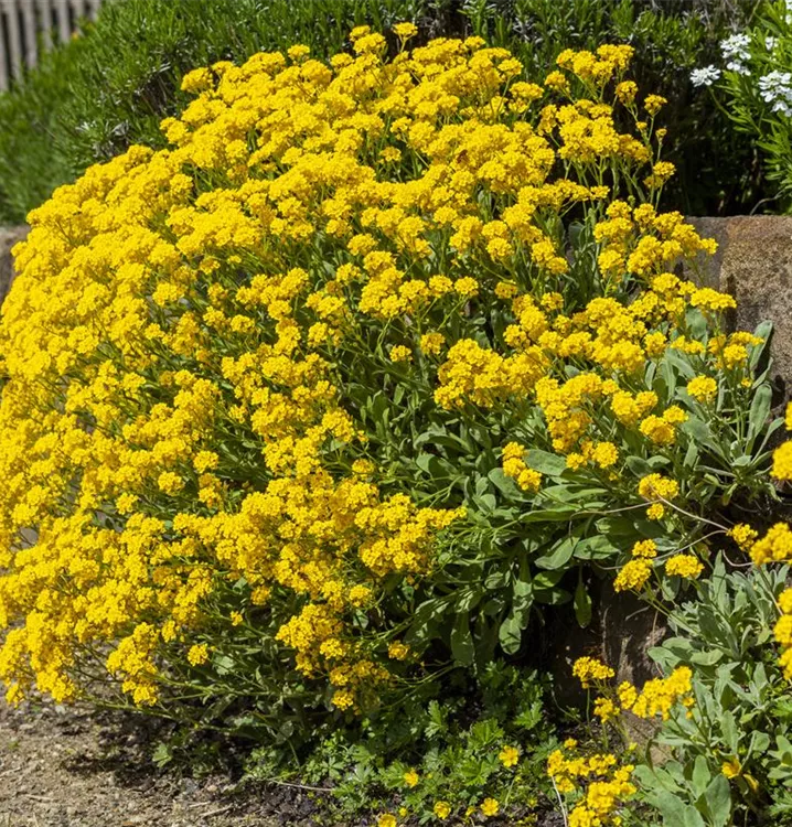 Aurinia saxatilis 'Goldkörbchen' bildet radförmige, gelbe Blüten ab April.