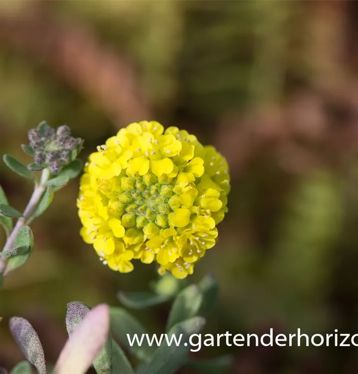 Alyssum montanum 'Luna' bildet in Trauben angeordnete, gelbe Blüten ab März. Diese verströmen einen leichten Duft.