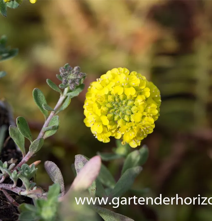 Das Garten-Berg-Steinkraut 'Luna' (Alyssum montanum) ist eine polsterbildende wintergrüne Staude, die von März bis Mai gelbe, in Trauben angeordnete Blüten mit einem leichten Duft bildet. An einem sonnigen Standort mit durchlässigem Boden erreicht es gewöhnlich eine Höhe von ca. 20 cm und wird ca. 40 cm breit. Das Garten-Berg-Steinkraut 'Luna' ist gut frostverträglich.
