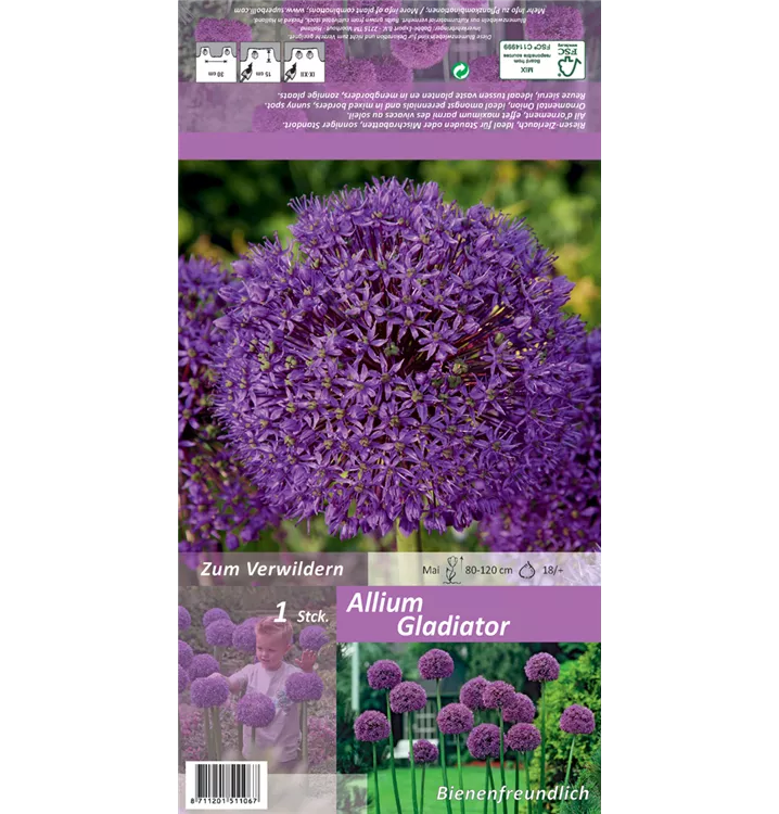 Welch eine Pracht, wenn der Garten-Kugel-Lauch 'Gladiator' ab Mai seine herrlichen, purpurvioletten, ballförmigen Blüten hervorbringt! Über den dunkelgrünen, linealen Blättern kommen die Blüten besonders gut zur Geltung. Wird Allium aflatunense 'Gladiator' an einen sonnigen Standort mit durchlässigem, humosem und nährstoffreichem Boden gepflanzt, entwickelt er sich besonders gut. Er wächst aufrecht und erreicht Größen von 1 m bis 1,2 m bei einer Breite von 15 cm bis 20 cm.