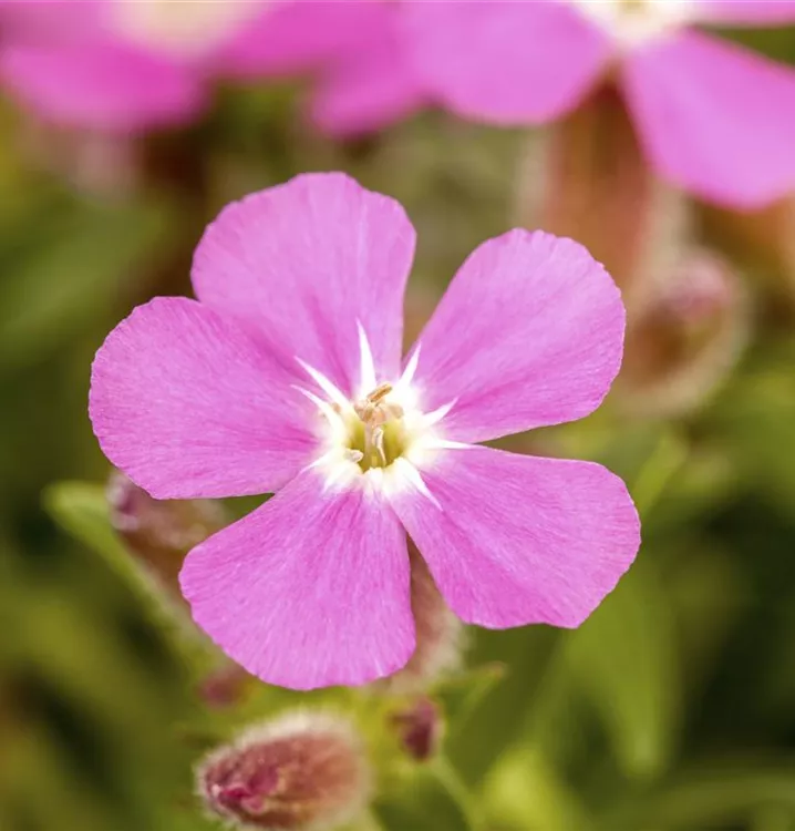 Saponaria x olivana 'Bressingham' bildet schalenförmige, pinke Blüten ab Juni.