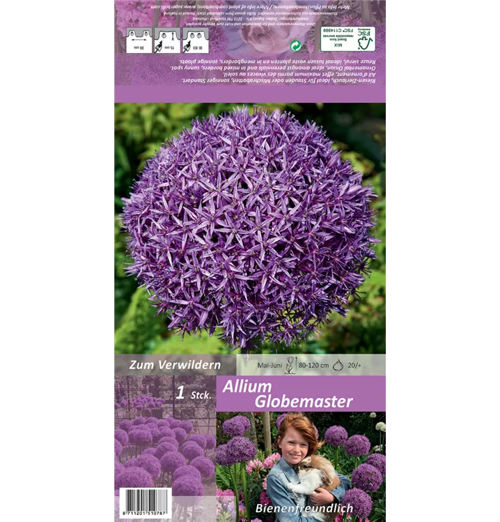 Welch eine Pracht, wenn der Garten-Zierlauch 'Globemaster' ab Juni seine herrlichen, violetten Blüten hervorbringt! Über den dunkelgrünen, linealen Blättern kommen die Blüten besonders gut zur Geltung. Wird Allium 'Globemaster' an einen sonnigen Standort mit durchlässigem, humosem und nährstoffreichem Boden gepflanzt, entwickelt er sich besonders gut. Er wächst aufrecht und erreicht Größen von 80 cm bis 1,2 m bei einer Breite von 20 cm bis 60 cm.