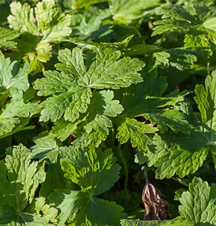 Hoher Blattschmuckwert. Die sommergrünen Blätter des Braunen Garten-Storchschnabels 'Raven' sind hellgrün, rundlich, gelappt.