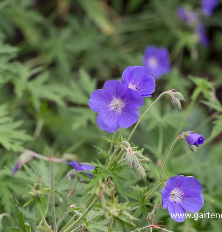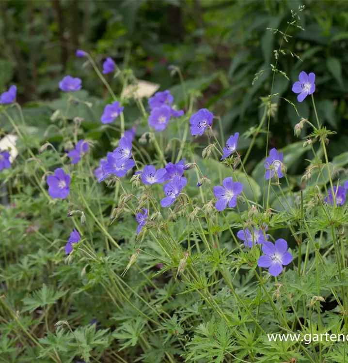 Geranium pratense 'Brookside' bildet schalenförmige, blauviolette Blüten ab Mai. Bei richtiger Pflege Nachblüte im September.