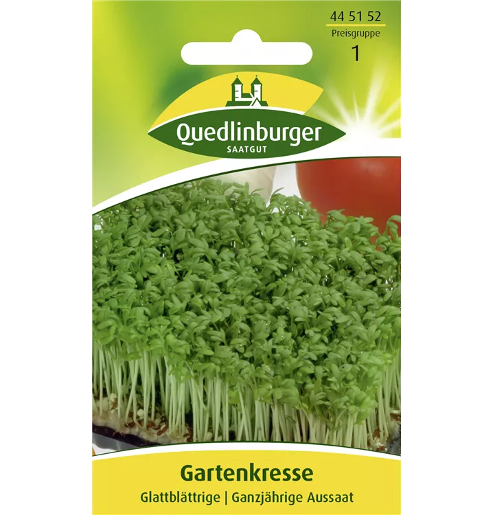 Die Glattblättrige Gartenkresse (Lepidium sativum) ist eine Kräuterpflanze mit einem pikanten Geschmack. Ihre dunkelgrünen Blätter sind herzförmig und gebuchtet. Für das optimale Wachstum der Glattblättrige Gartenkresse werden ein sonniger Standort und durchlässiger, nährstoffreicher Boden benötigt.