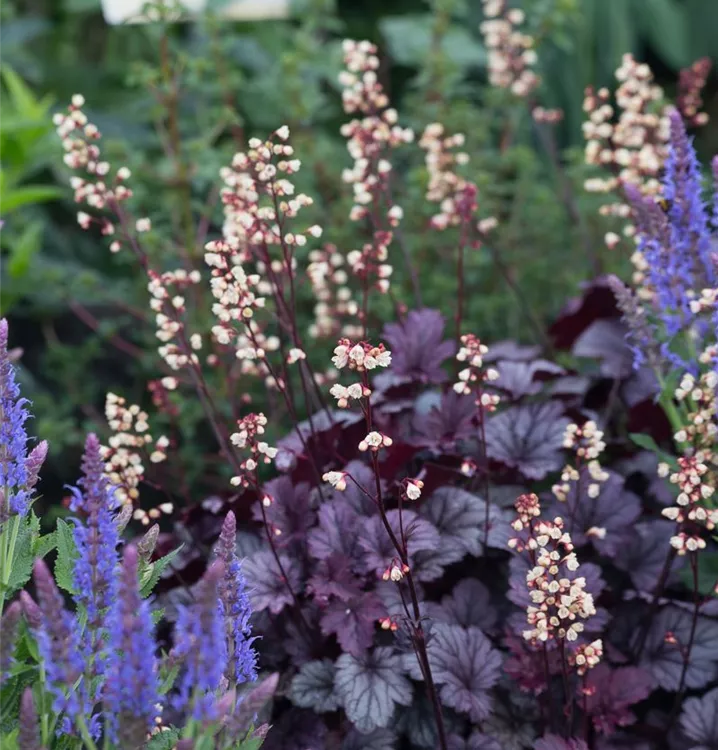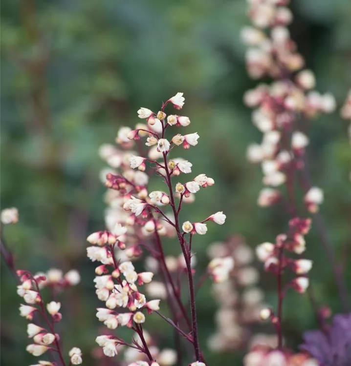 Heuchera micrantha bildet glockenförmige, in Trauben angeordnete, hellrosafarbene Blüten ab Juni.