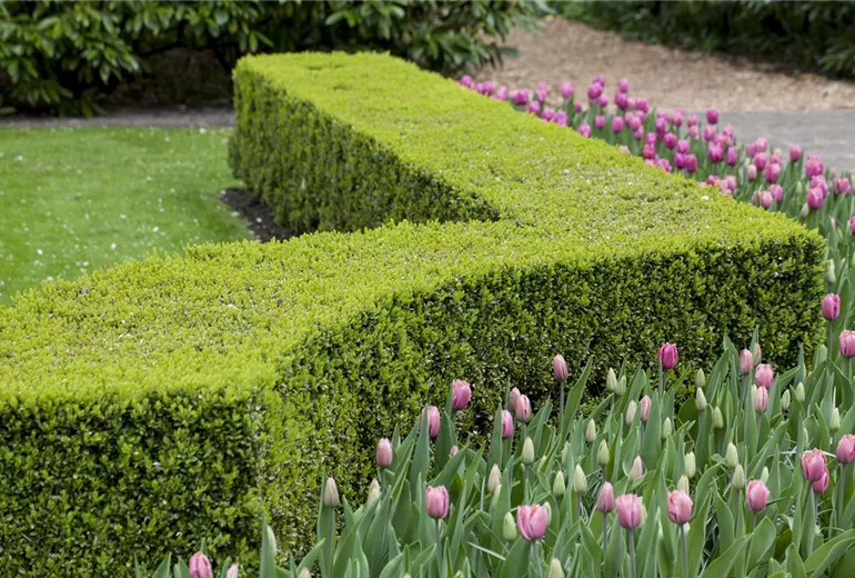 Überlegen Sie sich vor dem Kauf, wie Sie die Hecken am besten platzieren: In einem streng formalen Design mit geraden Linien und rechten Winkeln? Oder lieber in spielerischen Wellenlinien und Kreisformen? Beides hat seinen Reiz – allerdings sollte das dahinter stehende Schema dem Betrachter deutlich werden. Schließlich soll Ihr Arrangement gefällig wirken – und das ist nicht der Fall, wenn ein Kreis zu einem eingedellten Ei mutiert. Am besten, Sie skizzieren die gewünschten Formen erst auf dem Papier und markieren deren Verlauf später mit einer Linie aus Sägespänen oder einem langen Wasserschlauch im Garten.