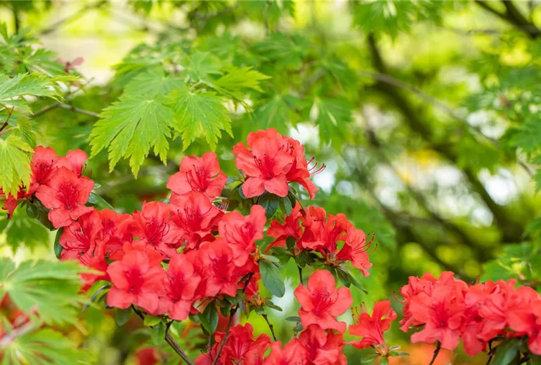 Rhododendren benötigen viel Platz. Wer nur einen kleinen Garten oder nur eine Terrasse hat, muss jedoch nicht auf die Pflanze verzichten. Gartengestaltung mit Rhododendron funktioniert auch hier, wenn man auf Zwergformen zurückgreift. Und Azaleen sind in ihrer Art und ihrem Aussehen den Rhododendren so ähnlich, dass sie inzwischen schon als Teil der Familie angesehen werden, auch aus gärtnerischer Sicht. Grundsätzlich haben Zwergformen des Rhododendron und Azaleen dieselben Ansprüche an Standort und Erde wie ihre großen Verwandten. Sie haben aber längst nicht so einen hohen Platzbedarf und lasen sich sogar in Kübeln kultivieren. Einige Azaleen werden als Zimmerpflanzen angeboten. Einige Gartenazaleen werfen über Winter ihr Laub ab. Sie begeistern im Garten also nicht nur mit schönen Blüten im Frühjahr und Frühsommer, sondern auch mit buntem Laub im Herbst und machen sich daher schön zwischen den immergrünen Blättern der Zwerg-Rhododendren. So lassen sich auch Rhododendren und Azaleen in verschiedenen Größen in der Gartengestaltung mit Rhododendron gut miteinander kombinieren.